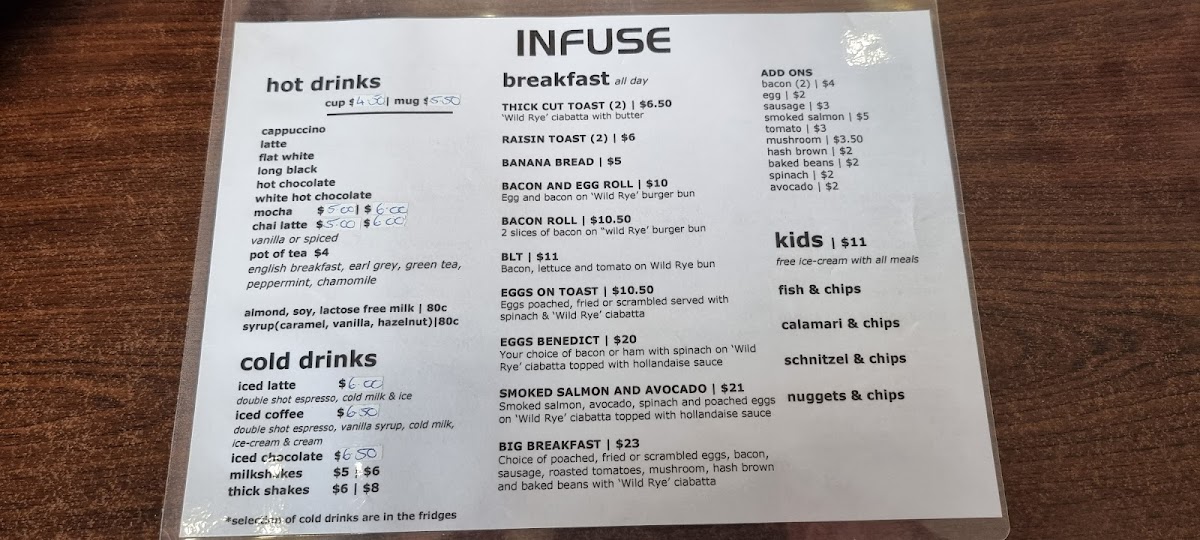 Welcome to Infuse, a charming cafe nestled in Tura Beach, NSW. With a menu that seems crafted for the beachside palate, Infuse offers a delightful array of options that cater to seafood lovers and comfort food enthusiasts alike. Highlights include their celebrated battered fish and calamari, both priced at A$17.00, and the ever-popular Fisherman’s Basket at A$21.00. Beyond seafood, the menu extends to juicy steak sandwiches and chicken schnitzel burgers, each under A$15.00.